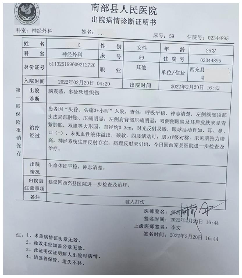 南部县人民医院诊断证明书显示,杨女士闺蜜25岁妹妹脑震荡,多处软组织伤。