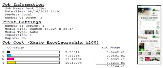 并且,据李总介绍,这款Xante数码印刷机另一特色是使用其自主研发的iQueue计算机软件,当计算机判读每一PDF图档之后,在印刷前计算机便可先分析显示每一单张印刷的油墨配色比率和油墨使用量;如下图印刷图档所示:34cm x 84cm的彩色纸板印刷,其印一张精确的油墨用量为0.3266ml=0.3266cc ;那么印一万张的油墨用量为0.3266 L (公升) = 省油墨用量!