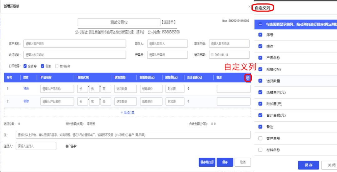送货单多个格式自定义选择!有些客户送货单上不需要显示客户单号可以隐藏送货单上的选项,不影响实际的价格对账,纸箱的尺寸,纸板的材质是客户要求。