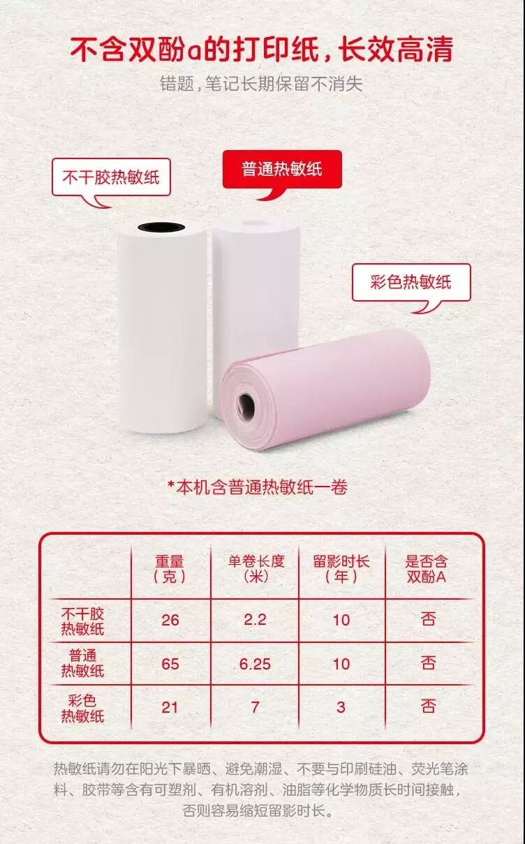 套餐里配的热敏纸是有道定制的,防潮、防油脂、防摩擦,相比于普通热敏纸,不含有害物质双酚A,通过了欧盟的强制性标准认证,更加安全环保,保护孩子健康,而且留影时间能长达10年之久。