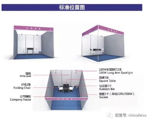 标准配套:三面围板,企业楣板,一张洽谈桌,两把折椅,两支射灯,一个纸篓,一个220V/5A插座(特殊用电须向展馆申请,另行收费)