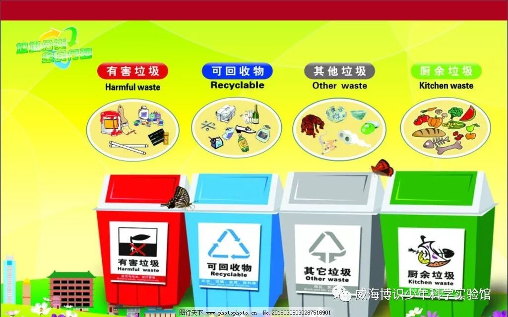 生活垃圾一般可分为四大类:1、可回收垃圾;2、厨余垃圾;3、有害垃圾;4、其它垃圾。
