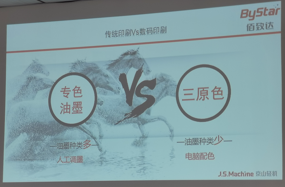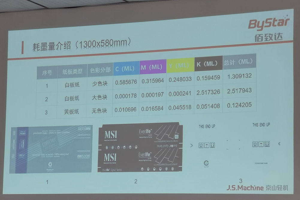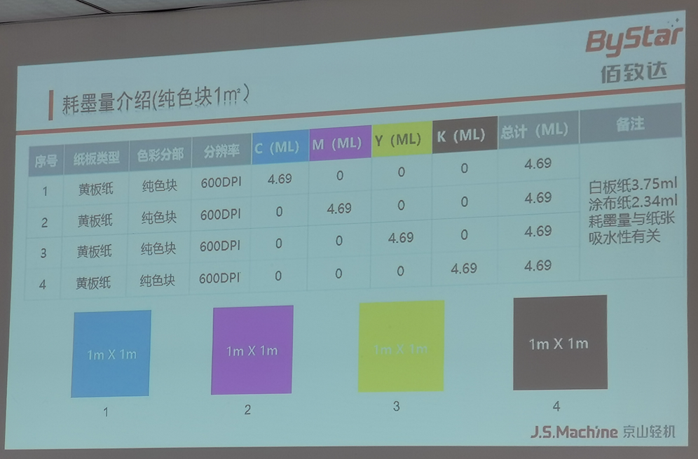 相关负责人在介绍京山的JS-SLIM2800数码印刷机的时候,就传统印刷和数码印刷方式,给出了一些生产数据进行对比,分析了数码印刷机在耗墨量、墨水成本、印刷成本等方面的表现。