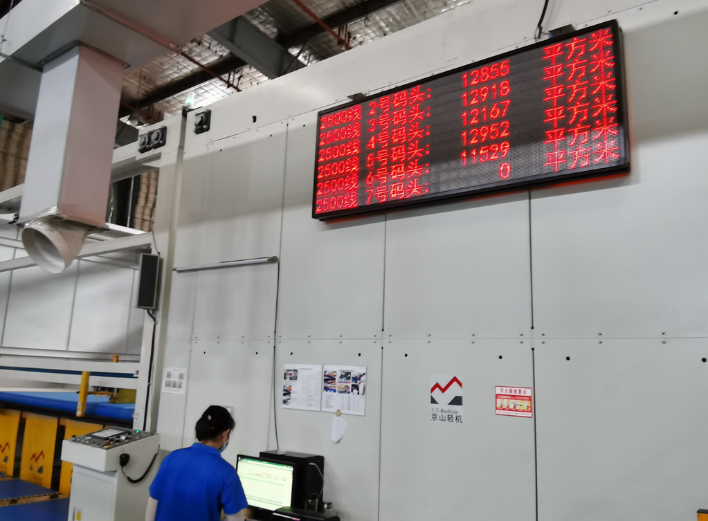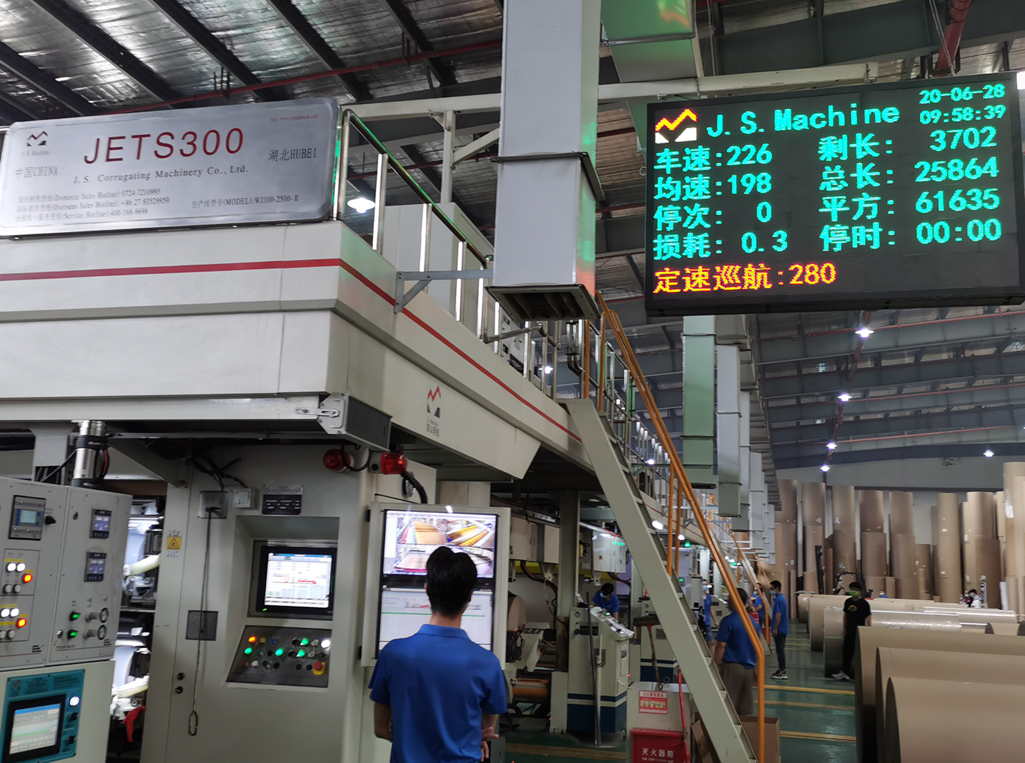 在凯露包装的瓦线车间,来宾们看到,在几个工人的操作下,这条京山JETS300-2500五层智能瓦线正在大展雄风。高处的显示屏上,瓦线车速、均速、生产长米、停机次数、损耗、瓦线各部位的动态等等信息,一直在实时显示中。6月28日当天截止到上午9点58分39秒,已经生产了61635平米。