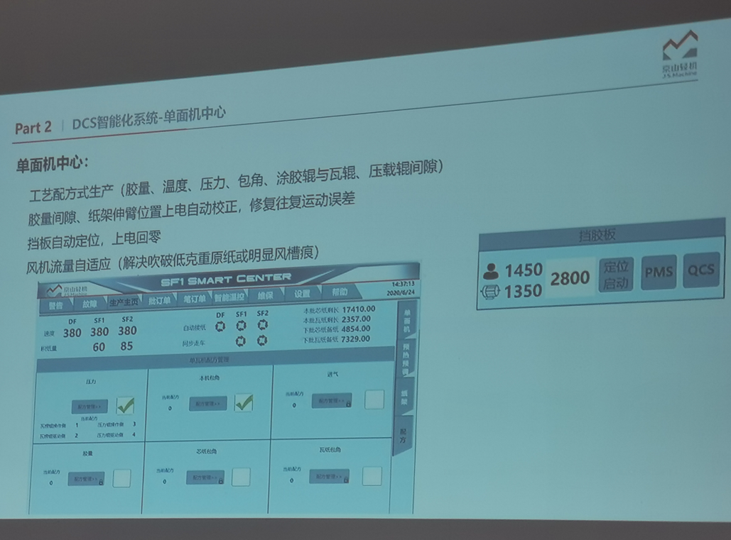热辊自动包角控制、自动胶量控制、热板温度自动调节、压板压力自动运行、订单配方管理、参数自适应/自学习,提高纸板质量,降低操作人员需求。