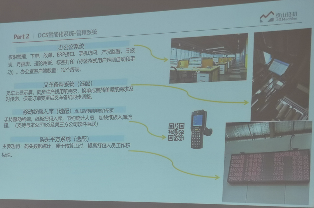 通过周总的讲解,来宾们对京山轻机智能工厂产品家族的雄厚实力甚为叹服。智能物流系统、智能软件控制系统、智能仓储系统、整厂规划智能方案,京山轻机智能工厂事业部,用智能技术,为纸板纸箱企业提供优化的工艺布局、智能设备解决方案,聚焦减员、提质、增效,协同纸板纸箱企业将生产利润最大化,推快企业的发展进程。