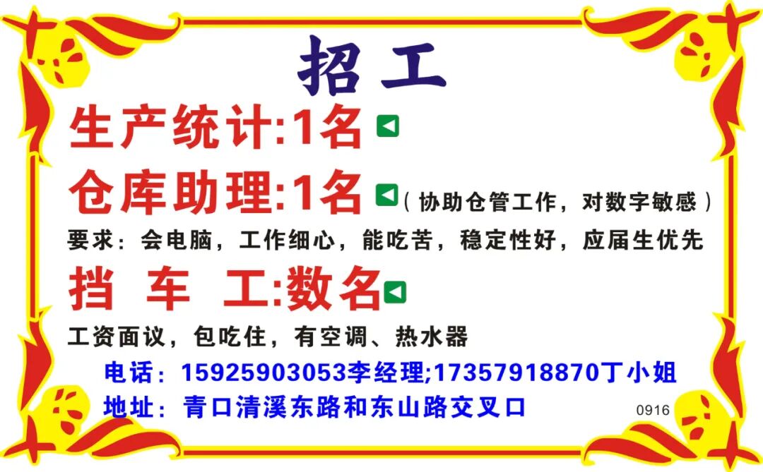 招工0916v5生产统计1名仓库助理1名(协助仓管工作,对数字敏感)要求:会电脑,工作细心,能吃苦,稳定性好,应届生优先挡车工 数名工资面议,包吃住,有空调热水器电话:15925903053李经理17357918870丁小姐地址:青口清溪东路和东山路交叉口
