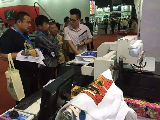 最新研发的数码直喷纺织机器,可在任何颜色布料上进行打印,颜色效果在展会上凸显而出,个性定制优选。