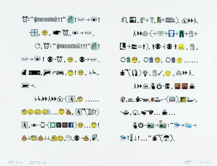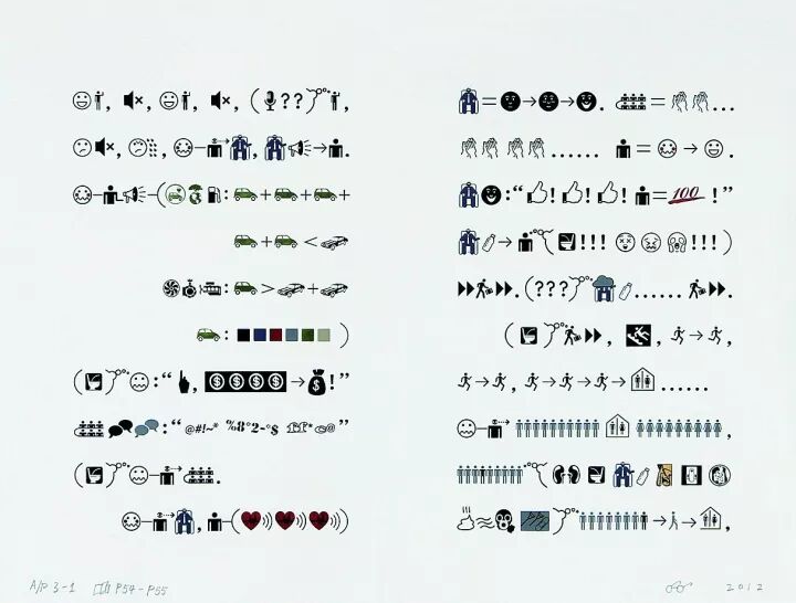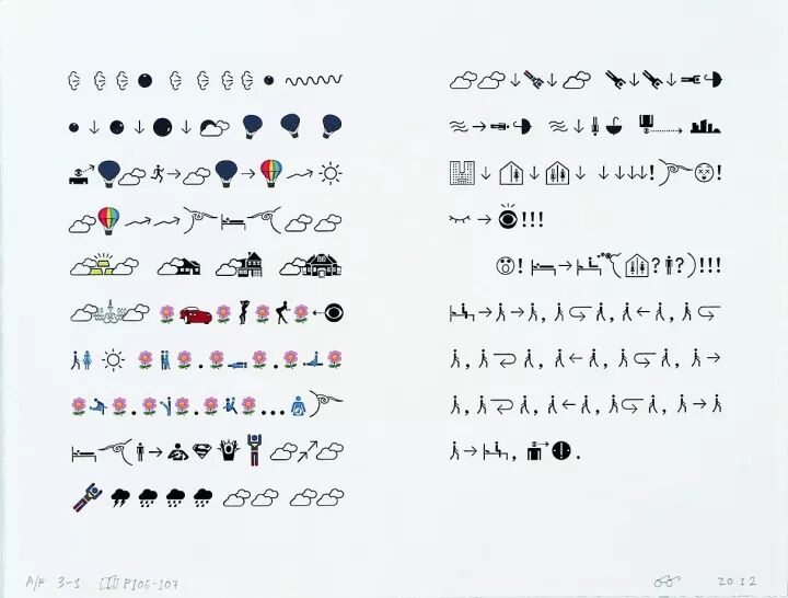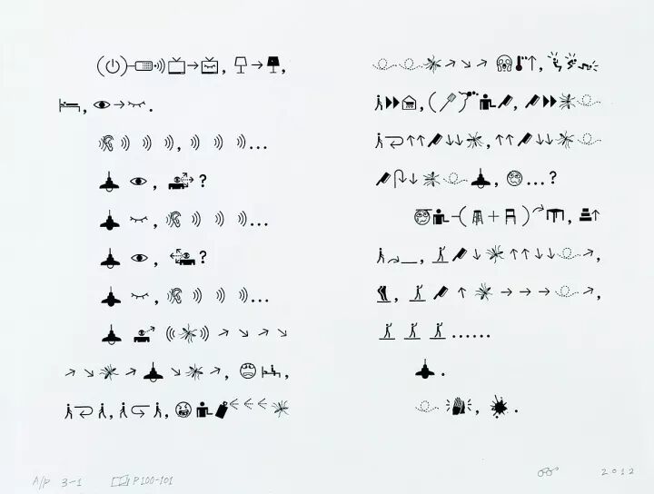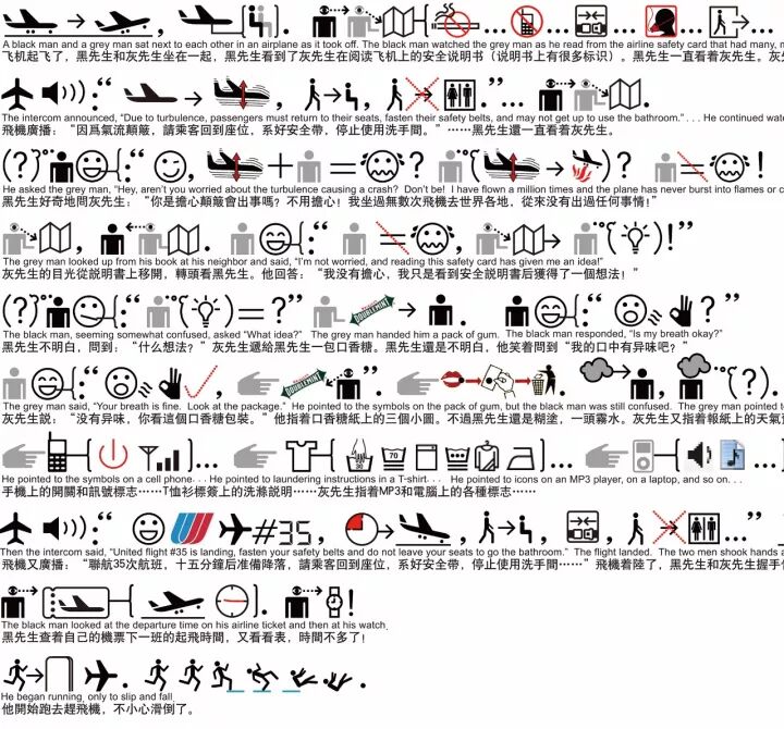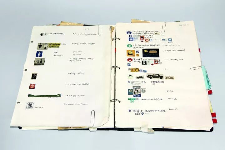 这项工作最早是从收集不同航空公司机上安全说明书开始的,在过去的十几年中, 我有很多的时间在机场和班机上度过. 机场的标识和各航空公司说明书的设计都以识图为主,用最低限的文字说清楚一件比较复杂的事情, 这点特别吸引我. 大约从99年到现在,我收集了有上百张这类说明书. 但当时并没有明确的收集目的. 2003年当我看到口香糖包装纸上的三个小图时(请将用过的胶状物扔在垃圾桶中), 我想: 只用标识既然可以表示一个简单的事情, 用它们就可以讲一个长篇的故事出来. 从那时起, 我开始通过各种渠道收集, 整理世界各地的标识,并开始研究数学, 化学, 物理, 制图, 乐图, 舞谱, 商标等专门领域的表达符号. 近年来,互联网迅速扩展, 电脑中Icon语言的大量出现, 使这个项目变得更加复杂和庞大. 但越是这样我越能感到这项工作的意义所在。
