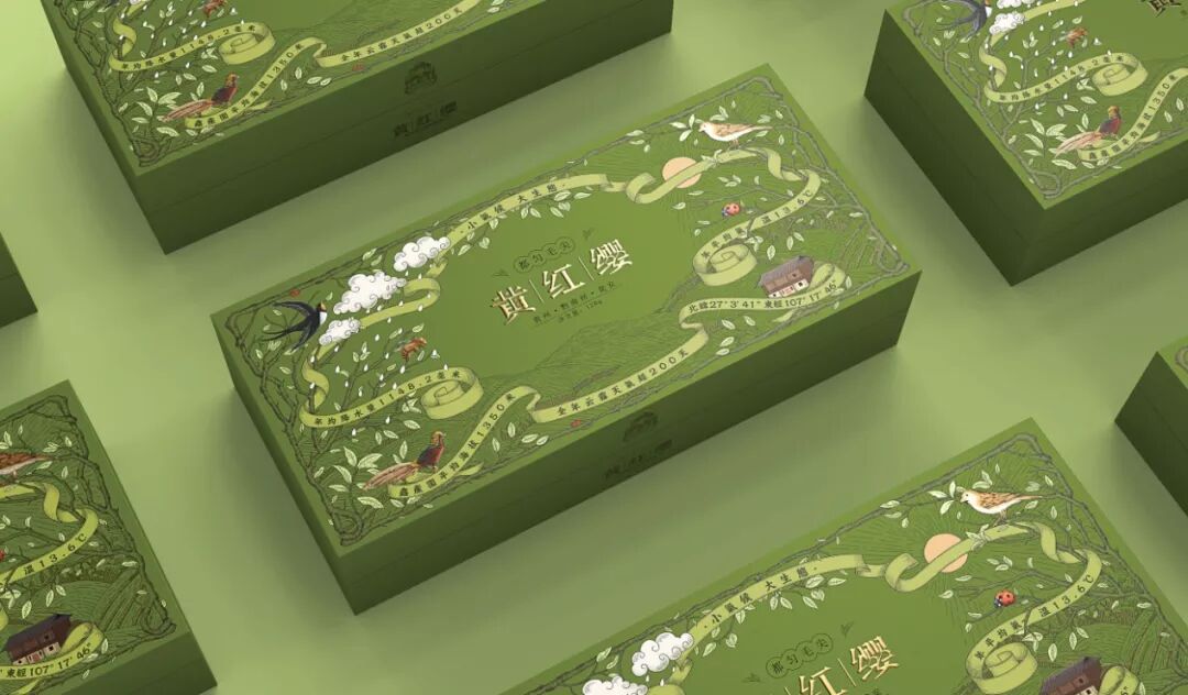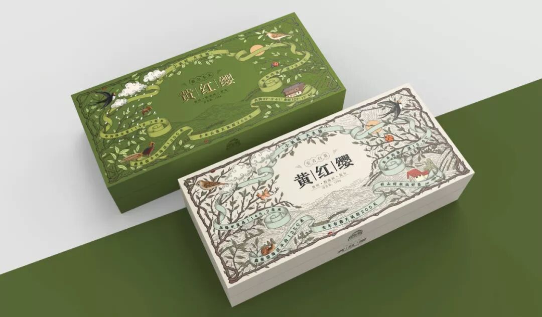 黄红缨茶的包装设计体现了茶叶种植的环境,通过插图的形式展现了茶坡气候、茶树的环境管理等方面,从不同角度展示了该产品的核心卖点。图像不仅展示了产茶地丰富的生态环境,也展示了人与自然的和谐共处,让更多的消费者能够直观地感受到这精心培育的产品背后的心血和专业知识。