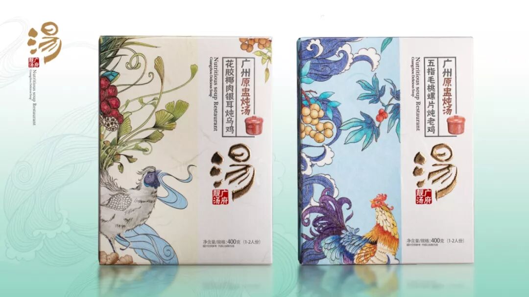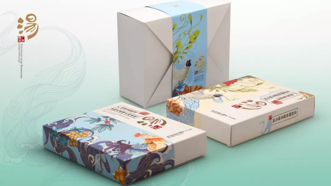 在中国广东,有一句广为流传的俗语宁可食无菜,不可食无汤。广东人民对汤的热爱发自肺腑,并且在漫长岁月中创造了无数美味和营养的滋补汤谱。广府靓汤的包装设计采用了多种传统的粤文化图案,每个插图都巧妙的展现了汤的成份与配料。
