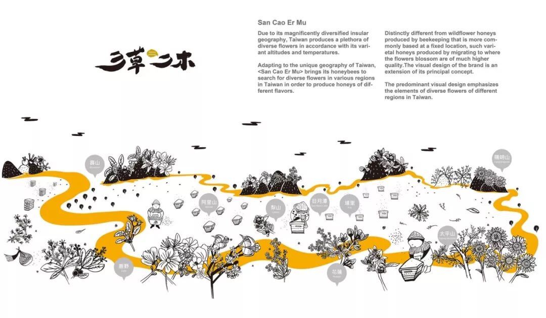 三草二木蜂蜜的包装展示了在台湾多样化的景观中寻找不同鲜花,生产蜂蜜的图景。这种视觉设计体现了该产品的核心价值和品牌形象,即每个国家的蜂蜜都是无与伦比的品种和独一无二的口味。