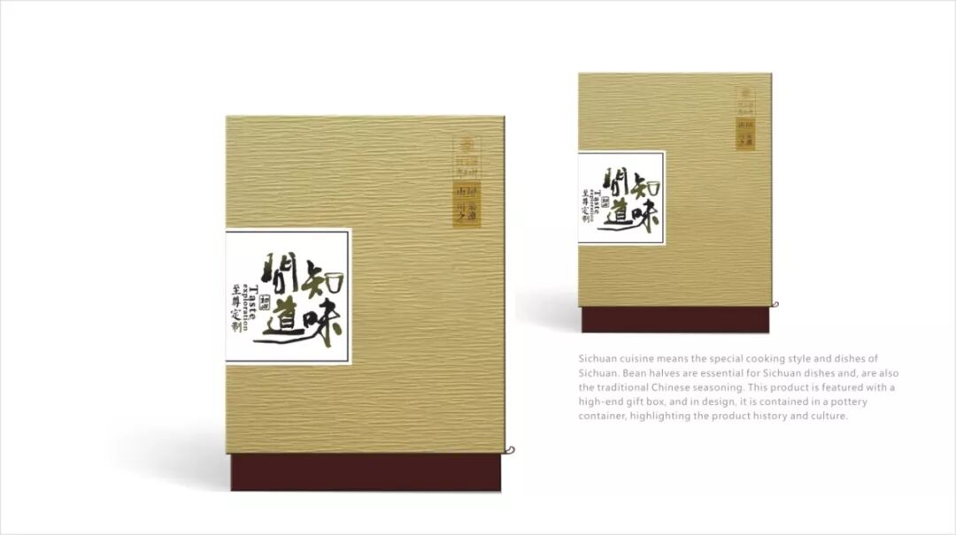 豆瓣酱是四川菜的必需品,也是传统的中国调味料。该产品采用高端礼品盒,将豆瓣酱装在陶器容器中,突出了产品背后的悠久的历史和文化。中国传统书法的使用赋予整个设计深刻而丰富的文化感,而生动灵活的质感则营造出现代感。