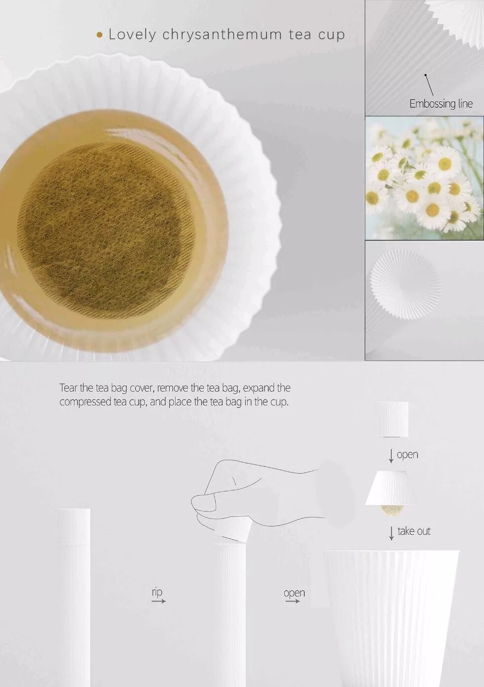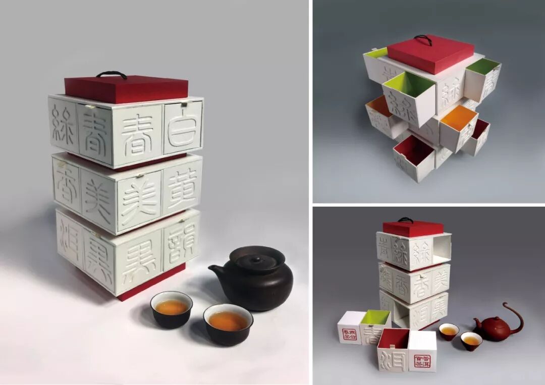 茶是中国人喜欢的饮品。琮是一个玉缸,在中国古代用于祭祀,琮的结构也是设计师对于产品的包装设计的灵感来源。改包装具有三层结构,每层有四个茶叶盒,每个盒子的正面够有一个浮雕汉字。汉字的字体是小印章,一种古老的汉字书法字体。每个字体代表不同种类的茶,12个相应的茶可以放在12个茶叶盒中。包装上装饰着中国书法,可以满足消费者收集不同茶叶的愿望。