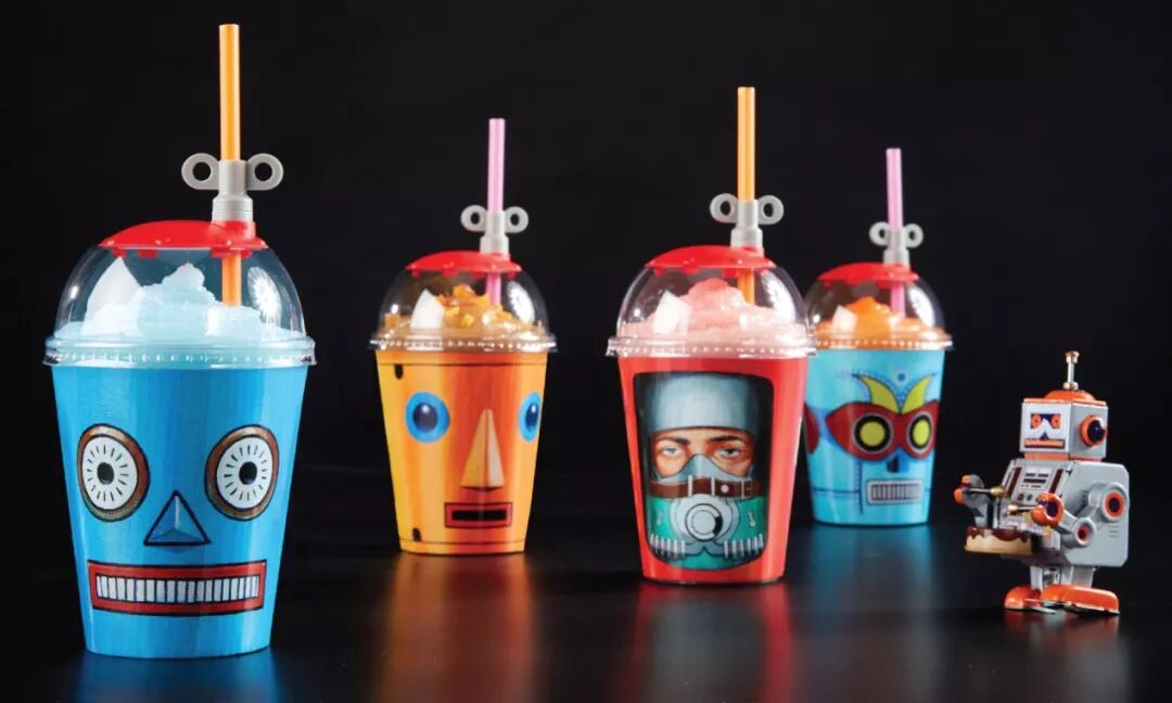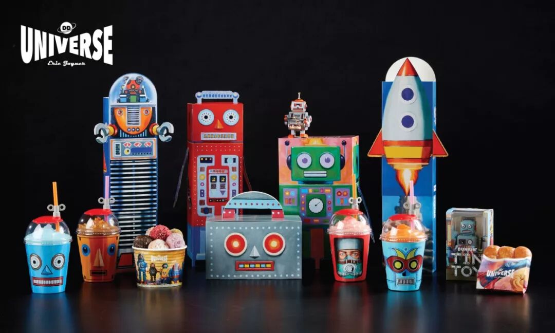 唐恩都乐遇到了喜欢机器人和甜甜圈的Eric Joyner,这次的品牌优化采用了各种机器人外形的包装来点缀产品,让人觉得这是一个既有趣又实用的设计理念。在我们将甜甜圈从包装袋内取出之后,外包装就可以被当成杯子来使用,而不是直接被我们视为废弃品丢进垃圾桶。这些杯子被设计得非常精美,有四种不同图案可以选择。同时,杯子里还有弹簧吸管架,可以用来喝混合饮料。