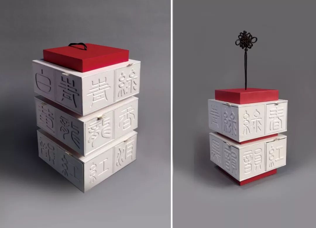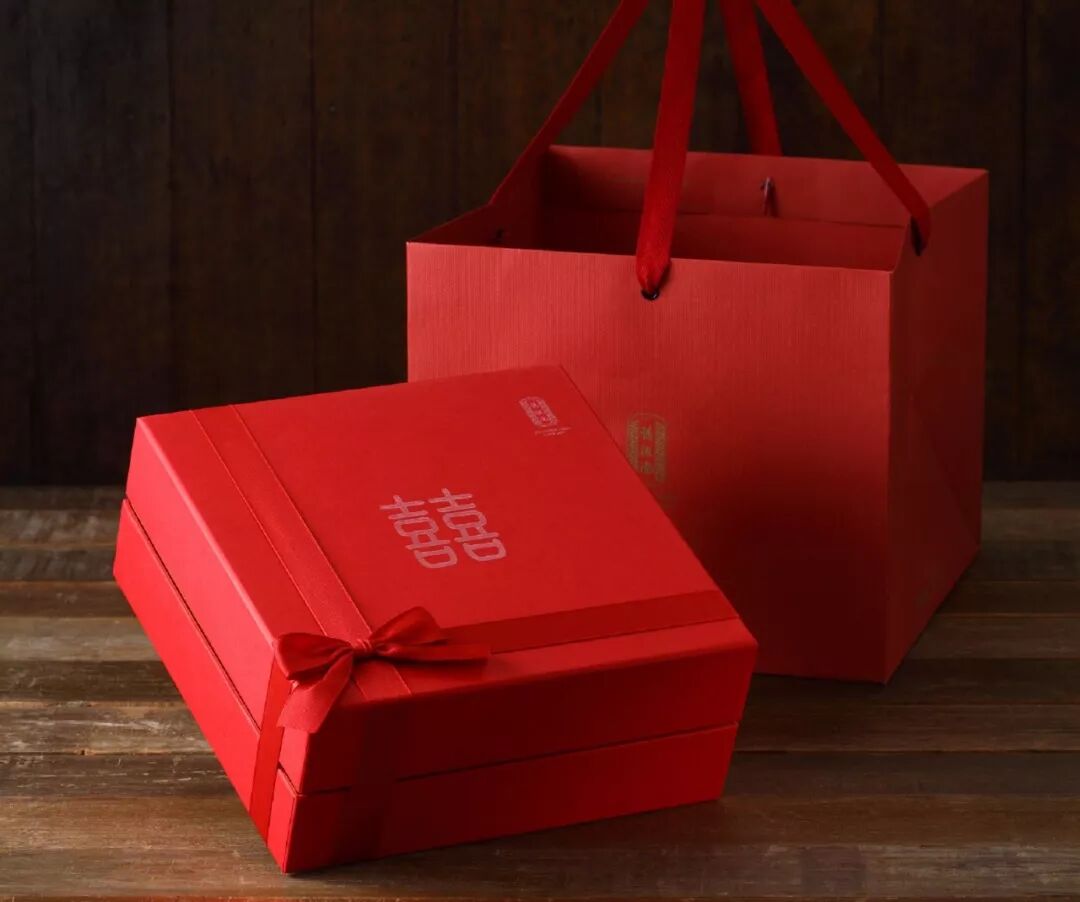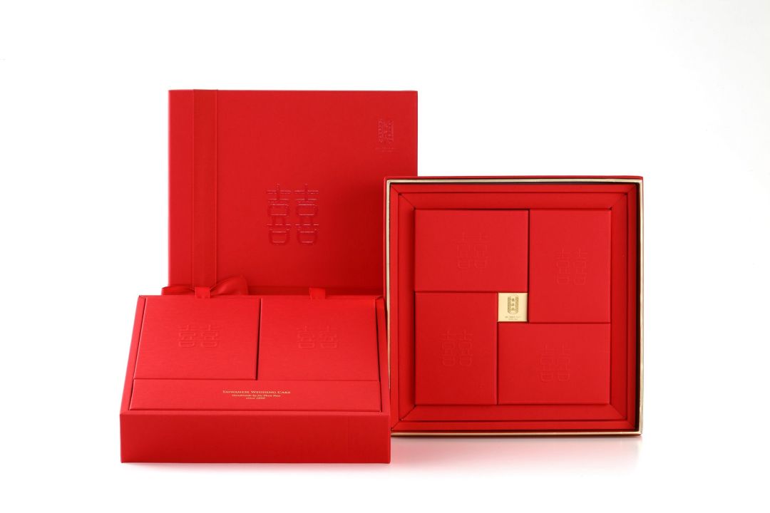 这个礼品盒是中国大陆和中国台湾的婚礼必备品,两层组件允许消费者混合搭配,顶层有两个中国糕点和彩色水果糖,底层有四个独立的盒子,分别装着不同种类的蛋糕、糖果和牛轧糖。礼盒外部采用红色层压艺术纸,内部用再生纸填充,以满足环保的标准。盖子的中间刻有汉字囍,象征着幸福美满。为了防止蝴蝶结的大小和形状发生变化,盒子最后用一条红丝带绑在松紧带上。
