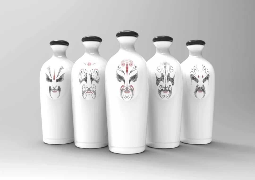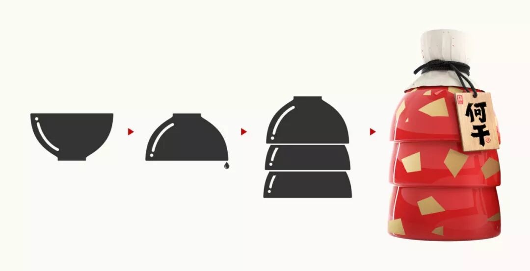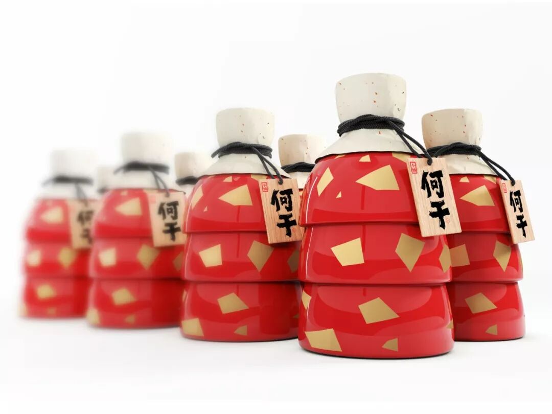 这款产品是来自中国陕西省的一种酒类产品。在中文中,产品名称(何干)听起来非常类似于喝干,这意味着喝酒。中国人喝酒后往往会把容器翻过来,这表明他们确实已经喝完了所有的酒。这个习惯在设计中被捕捉和可视化-三个碗倒置摆放。这种设计也体现了陕西人民的大胆和激情。同时,独特的产品外观也有助于将品牌给消费者留下深刻印象。
