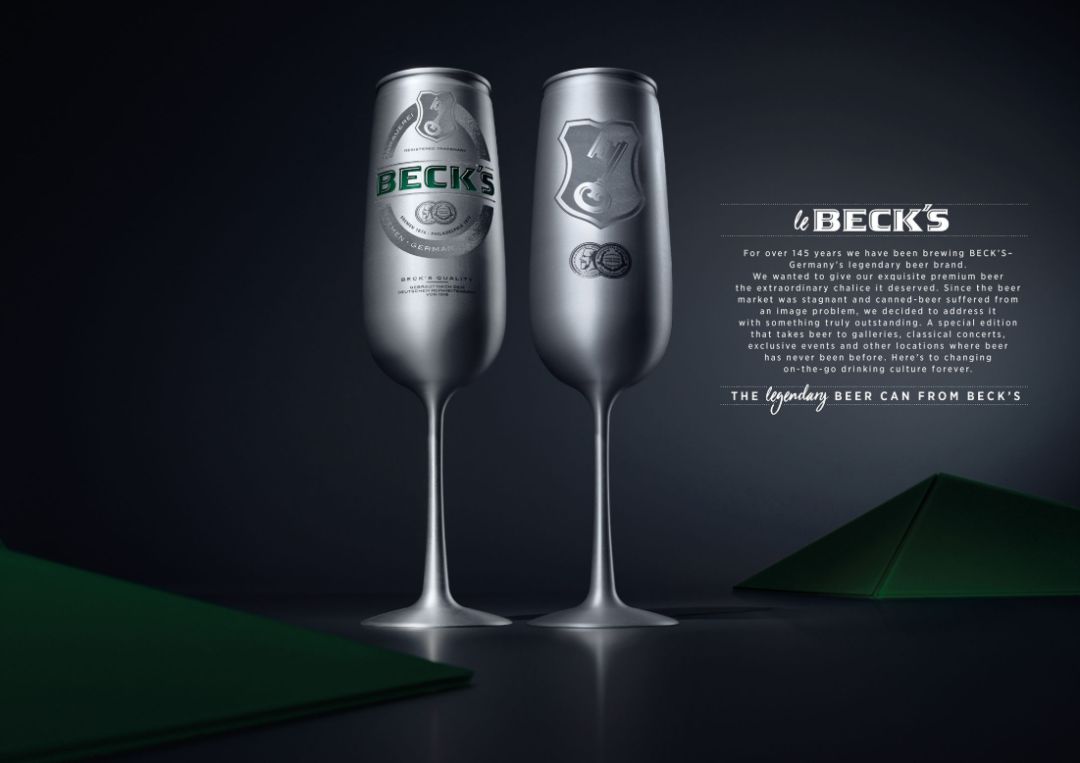 Beck’s品牌致力于酿造高品质和绝佳口感的啤酒已经超过145年时间。为了克服目前啤酒市场的停滞和罐装啤酒的形象问题,Beck’s 决定为优质的啤酒提供合适的外包装:由拉丝铝精心制造的啤酒罐,且由多种激光和模拟雕刻装饰。Beck’s 称之为Le BECK‘s,也是来源于对香槟杯外观的一种肯定。Le BECK’s是一款限量版产品,以鼓励Beck的顾客将他们喜爱的优质啤酒与新的饮用方式联系起来。5,000件精心制作的限量版啤酒于2018年3月1日亮相市场。
