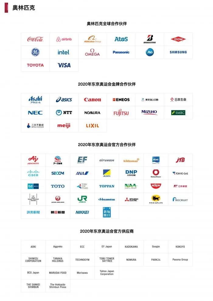 此外还有20家企业,通过提供服务与合作成为东京奥运会官方供应商,包括谷歌日本、雅虎日本、波士顿咨询集团等。