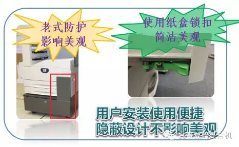 为了解决复合机使用过程中纸张被挪用、浪费使用的现象,夏普推出了纸盒锁扣解决方案。该方案采用夏普独特的设计工艺,只需要在纸盒中内置一个简单易用部件,就能牢牢地给纸盒锁定。相比市场上的普通的外置纸盒锁,夏普纸盒锁扣安装使用便捷,且这种隐蔽式的结构看起来更加美观。