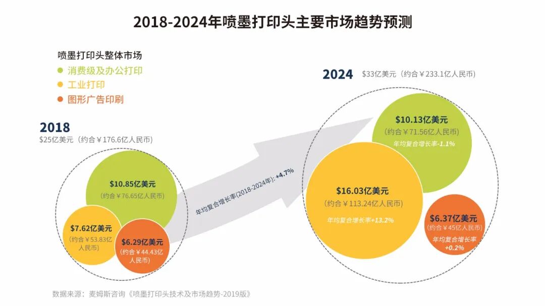 据麦姆斯咨询报道,喷墨打印头市场2024年的营收预计可达33亿美元(约合233.9亿人民币),2018年-2024年期间的复合年增长率(CAGR)超过4.7%,同期,工业打印头市场的复合年增长率(同比)可达13.26%。终端用户需求、定制和需求的变化激发了工业打印市场,促进了对喷墨打印技术有巨大兴趣的数字打印。