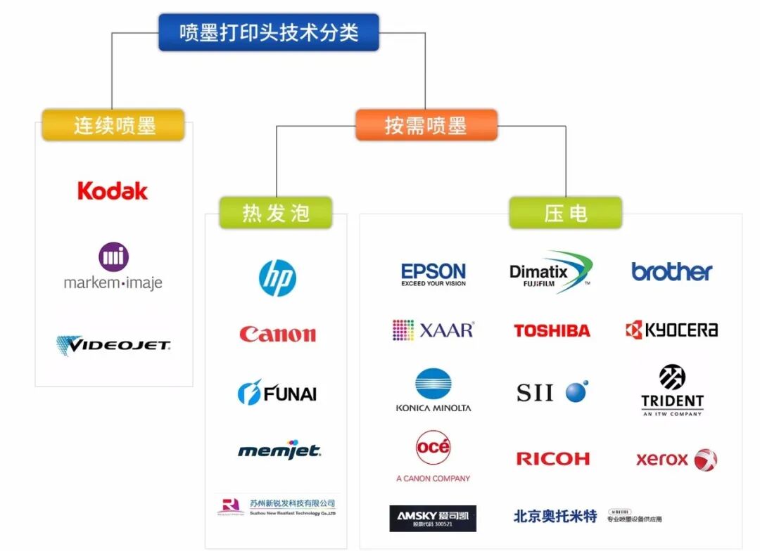 其中,在连续喷墨技术产品领域知名厂商有柯达Kodak(美国)、马肯依玛士Markem-imaje(美法合资)、伟迪捷Videojet(美国)等;在按需喷墨的热发泡喷墨技术领域知名厂商有惠普HP(美国)、佳能Canon(日本)、船井电机Funai(日本)、Memjet(澳大利亚)、上海锐尔发数码科技有限公司(中国)等;在按需喷墨的压电喷墨技术领域知名厂商有爱普生Epson(日本)、赛尔XAAR(英国)、柯尼卡美能达Konica Minolta(日本)、奥西Oce(已被佳能收购)、富士Fuji Dimatix(日本)、东芝Toshiba(日本)、精工公司SII Printek Inc.(日本)、理光Ricoh(日本)、兄弟Brother(日本)、京瓷Kyocera(日本)、泰鼎Trident(美国)、施乐Xerox(美国)、北京奥润联创微电子科技开发有限公司(中国)、爱司凯科技股份有限公司(中国)等。
