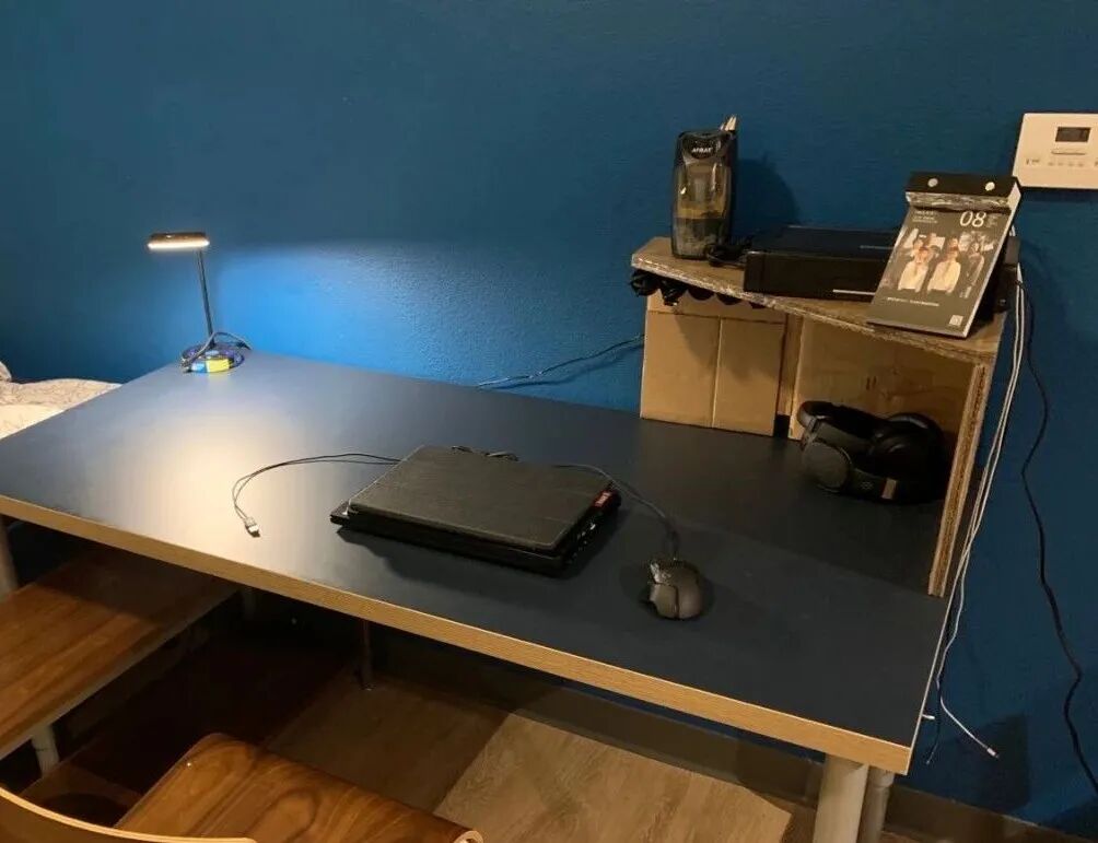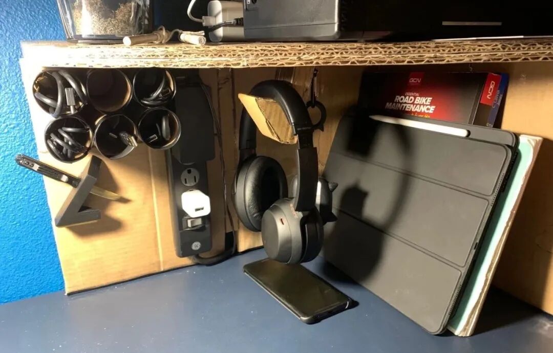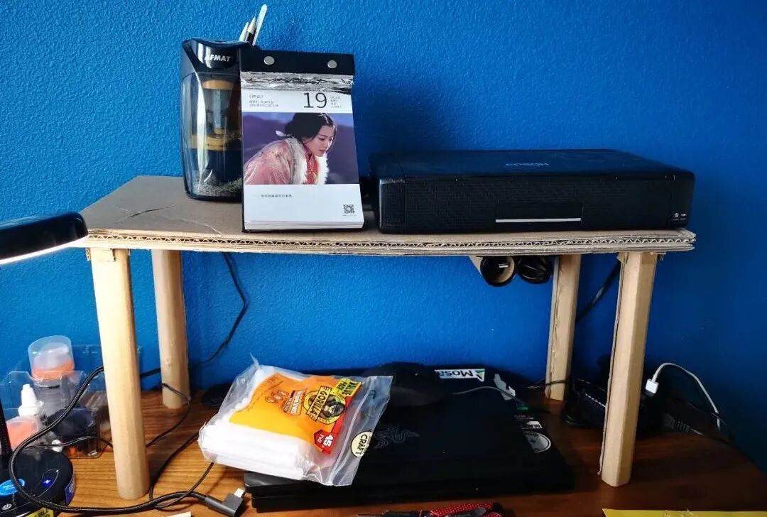 后来的中期小改款:改变了卫生纸筒的排列;增加了插线板;把拆快递专用刀的底座直接粘死,免得拔刀的时候它乱跑;将闲置小桌板分尸后改造成耳机挂钩;底部增加防滑材料这样可以放几本书。
