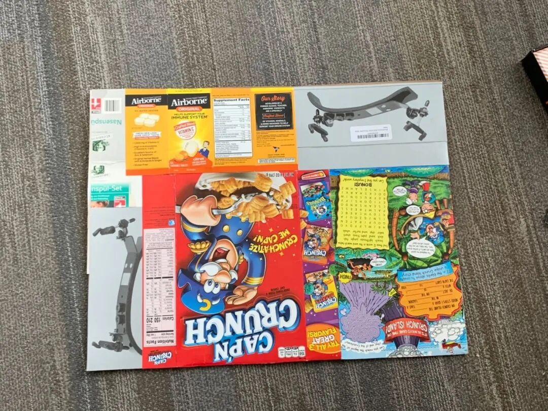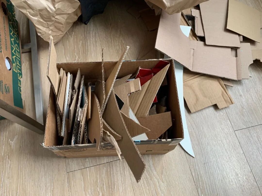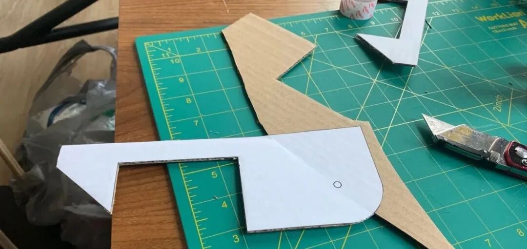 因为有专门收集边角料的盒子,所以填坑"的小块材料并不需要从整块纸板上剪裁,找一块外形相似的边角料即可,更大程度地减少浪费。从多年来的经验分析,一般单边长度超过2英寸的会被认定为边角料保存, 其它的就太小了,不值得保留。大块的边角料(大到这个盒子装不下)就和还未开垦的原料堆在一起。