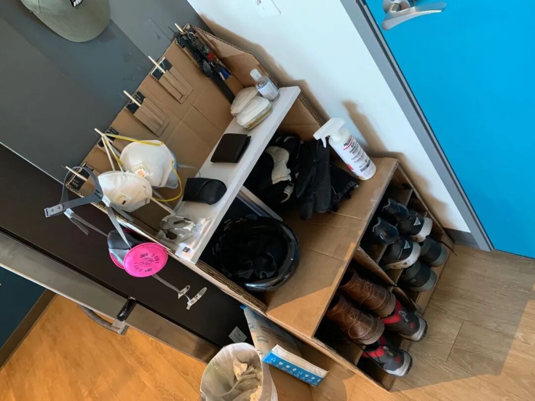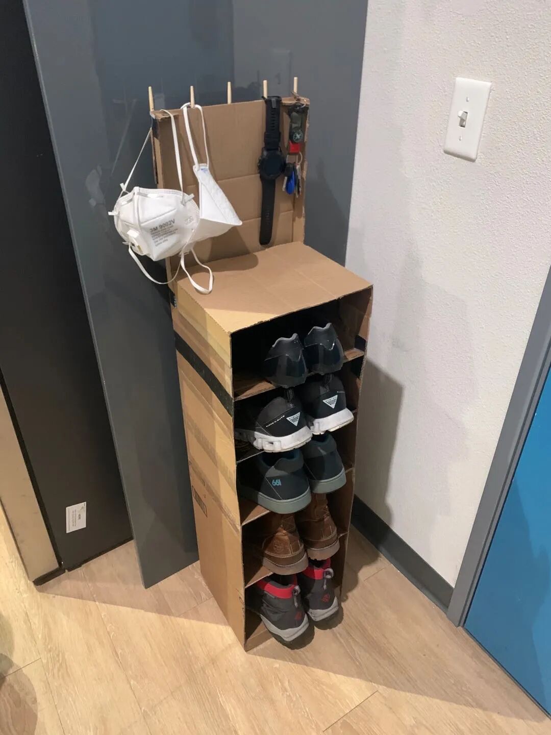 其实V1版本的鞋柜在设计上并没有任何失误,使用上除了单层纸板有些摇摇欲坠之外也很顺手。唯一的问题如图:上面这一层放东西的地方没想到会这么方便!已经快放不下了。故V2版本在加固至三层纸板的同时,将柜子改为双排,不光增加了单层储物面积,还直接多盖了一层。