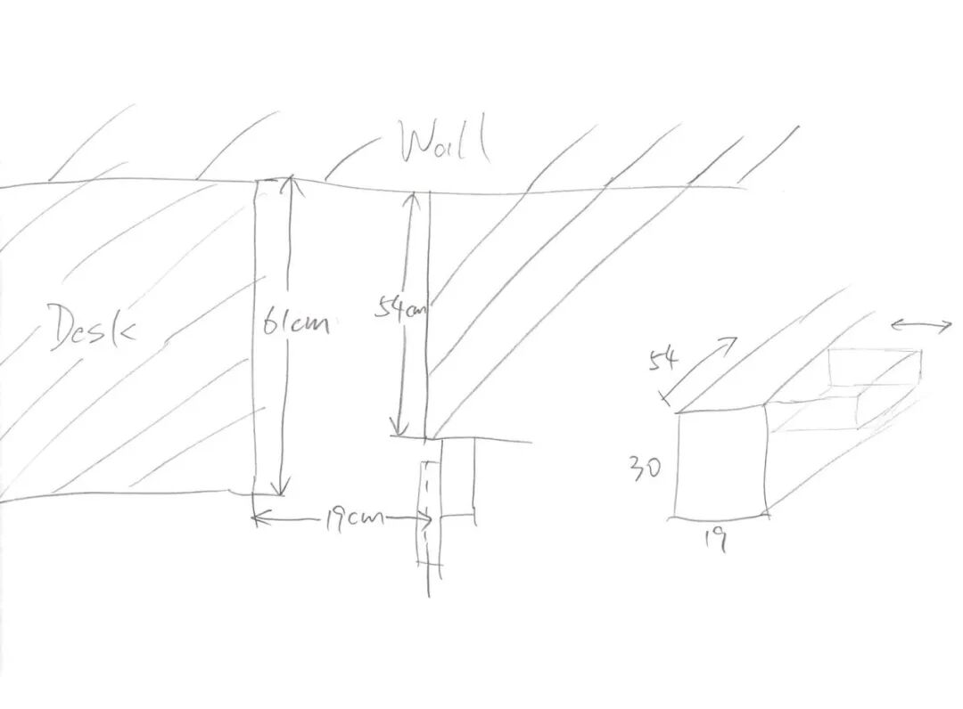 改进版小二层很快提上日程。新的设计使用了梯形,这样短边那个角可以不需要支撑,丝毫不影响桌面的使用面积。支撑由柱子换成了板子。