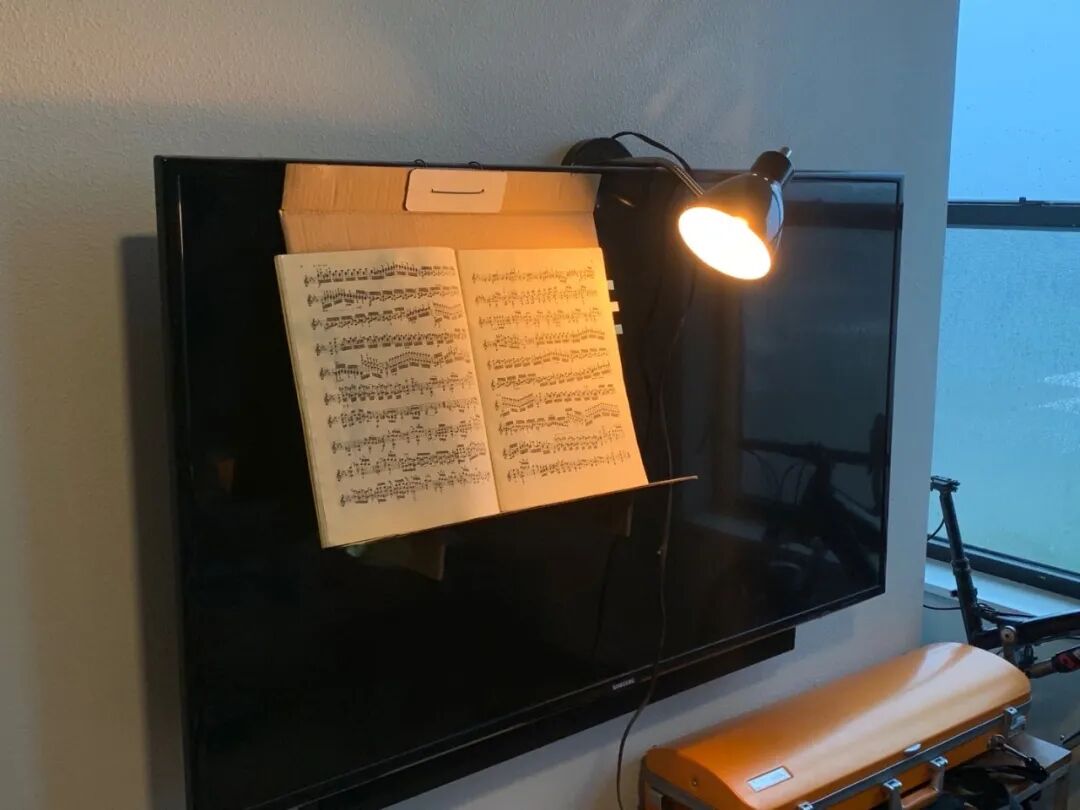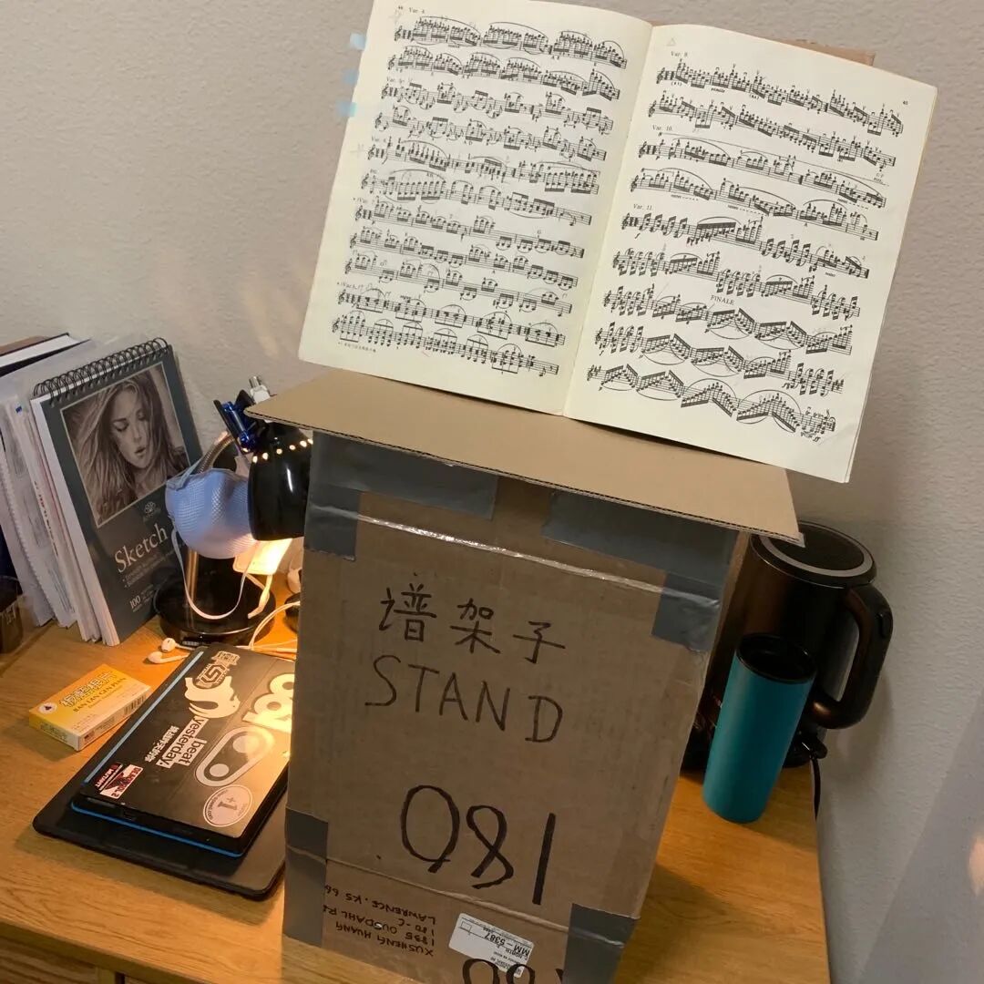 直接做一个谱架子太费事了,所以利用了桌子本身的高度,再架起到所需高度,省事得多。