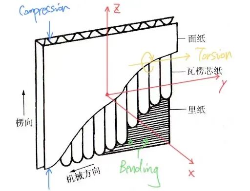 其实受力情况无非三种:张力/压力(算一种)、扭力和弯曲力。纸板这种材料就是楞向可以承受很大的压力,虽然也可以承受垂直于面纸的楞向弯曲力和垂直于楞向平面方向的扭力,但是表现并不突出。