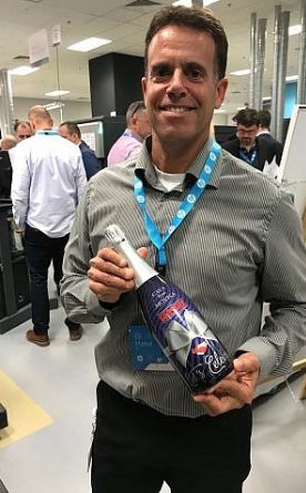 惠普Indigo市场营销经理伊莱·马哈尔手拿一瓶外包装由该公司银墨打印的饮品。(图片来源:Shoshanna Solomon/Times of Israel)