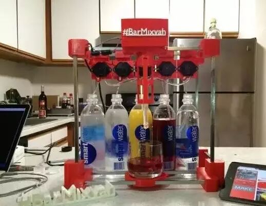 毕业于加州大学洛杉矶分校电气工程的Yu Jiang Tham,设计并制造了一台酒保机器人,取名Mixvah酒吧,能混合各种液体。所有部件均3D打印而成。Mixvah酒吧采用5个双极型结晶体管(TIP120),运行Arduino系统。 平板电脑上运行Johnny-Five 软件包,以远程操控Arduino。