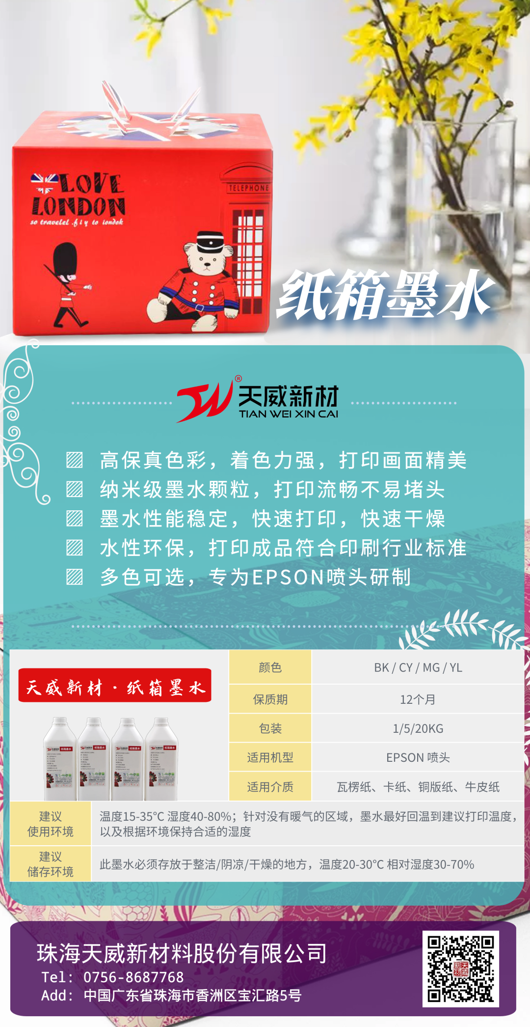 天威新材纸箱染料墨水,鲜艳色彩高度保真着色力强,可搭配高速瓦楞纸板数码365bet在线体育投注网_365bet在线体育_365被限制如何解决 演绎高精度打印品质。在对包装纸箱需求愈来愈旺盛的今天,正为瓦楞包装行业带来一场新的发展机遇。
