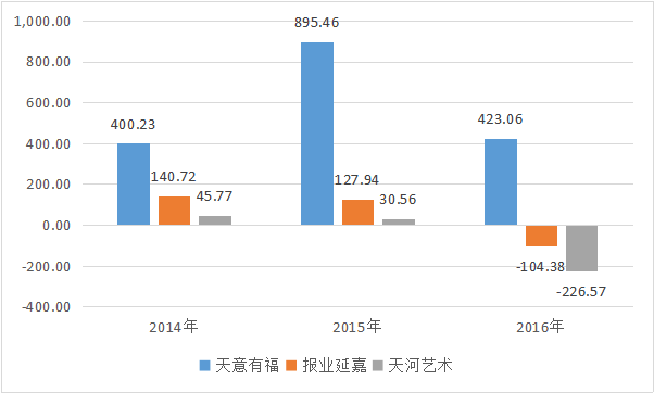 那它们究竟赚到了多少钱呢?2016年,天意有福归属于挂牌公司股东的净利润为423.06万元,报业延嘉为-104.38万元,天河艺术为-226.57万元。一赚两亏,且与2015年相比,均出现明显下滑。
