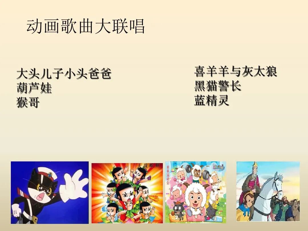 1、欣赏动画片〈〈米老鼠和唐老鸭〉〉、〈〈黑猫警长〉〉、〈〈葫芦兄弟〉〉、〈〈宝莲灯〉〉中的音乐。