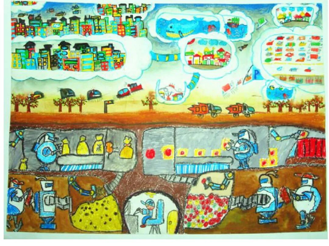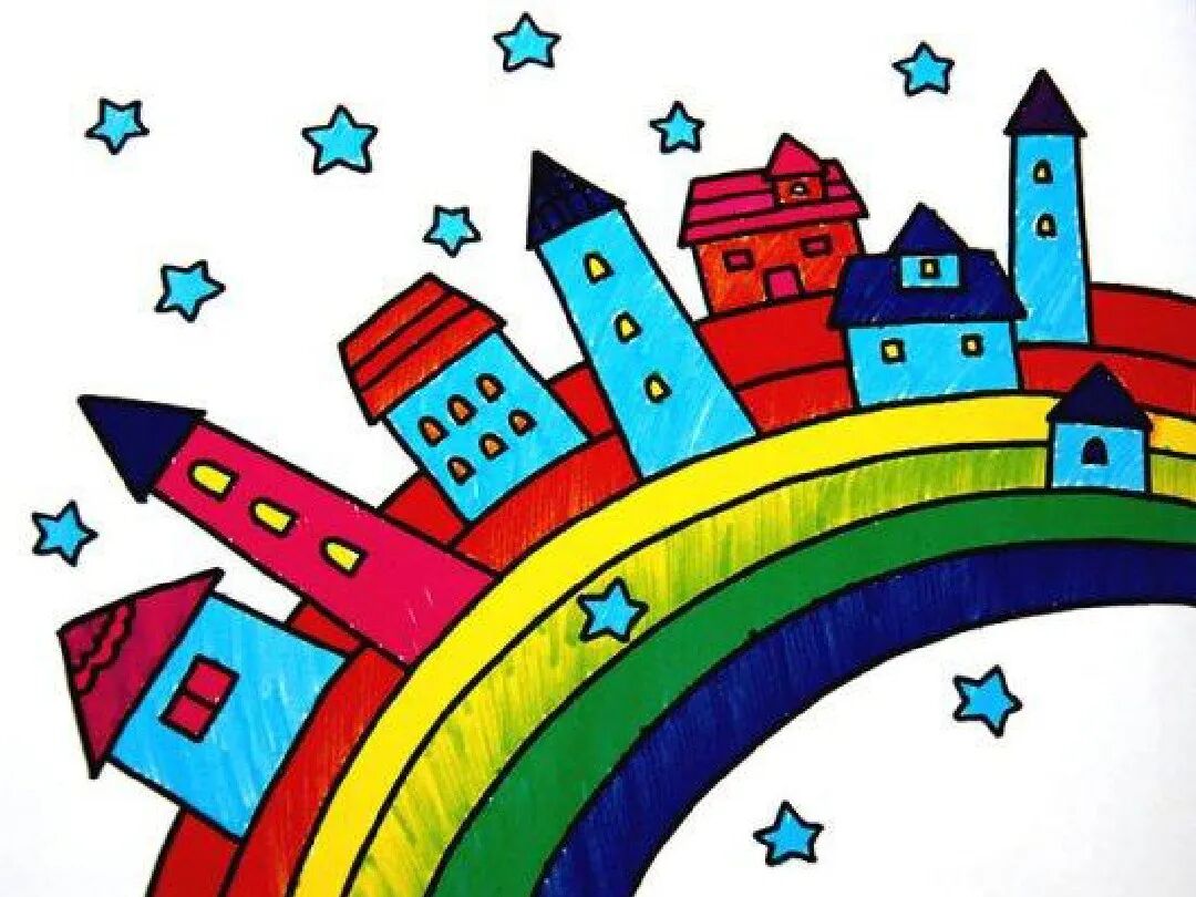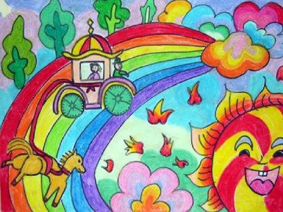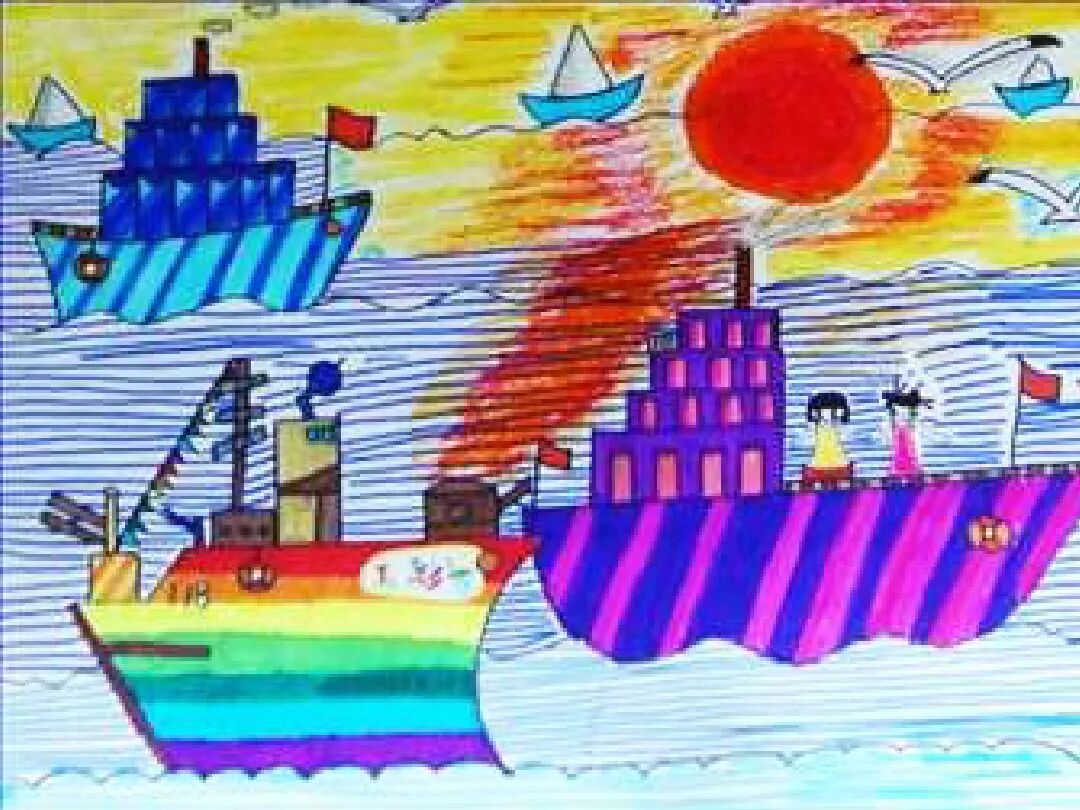 在认识常用的色彩名称之后,学生可以使用油画棒、水彩笔、或水粉颜料等,采用色块并置或勾线平涂的方法进行色彩的自由表现。以游戏我带色彩滑旱冰的情景引入,引导学生在作业纸的上下、左右及对角的范围内,运用灵活的线条或色彩,采用勾线平涂或色块并置的方法来大胆的涂画整个画面,并且可让学生们边画边给自己画加上丰富的想象,这样既锻炼了学生构图的饱满,,也发挥了孩子们的想象力。