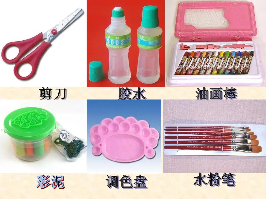 油画棒、水彩笔、水粉颜料、水粉笔、剪刀、胶棒、彩纸、彩泥、陶泥等。