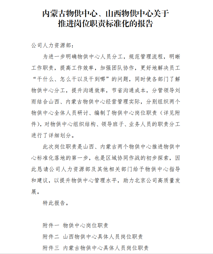 推进标准化物供中心建设,以山西、内蒙古物供中心为试点,规范管理流程,明晰岗位职责,责任分工到人,提高工作效率。