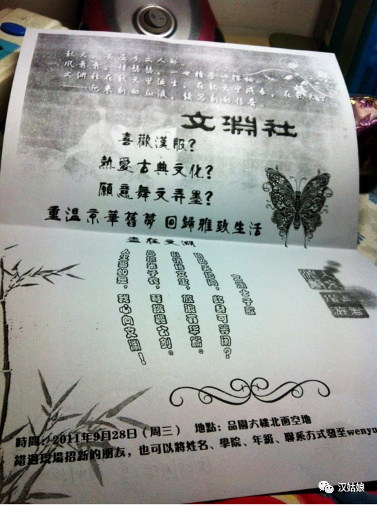 就在我接手社团的同一个月,有一位大我一届的同袍师姐刚好向学校申请下来一个新社团的名额,暂定名称为青衫汉服社。一边有汉服社的名额,一边手头接来了一个实体的汉服社,于是我俩一拍即合,把这两者合并起来,于是人大文渊社从此正式成为人大文渊汉服社。