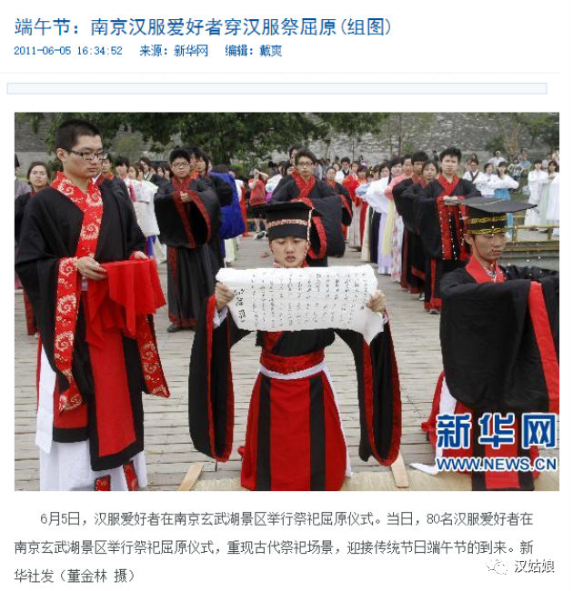 2011年6月5日晚上,高考前的那个周日,我晚饭后习惯浏览报纸的我在省内发行的《扬子晚报》上偶然看见了一则消息,一下子就引起了我的注意,那小小的豆腐块一样的报纸边角区域写着南京汉服爱好者过传统端午节,下面还配了一张黑白色的、印刷质量高糊的活动照片,是一排长裾及地的年轻人的合影。