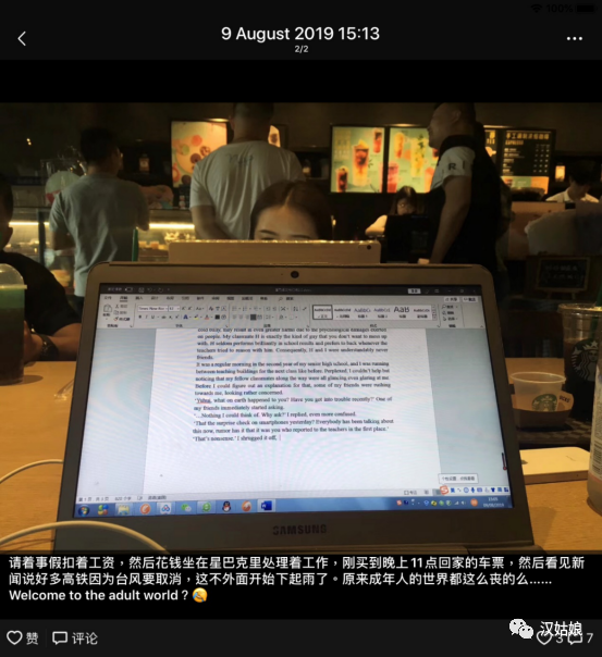 不料9号这天正值台风,江浙沿线的很多高铁都取消了。因为不知道什么时候能写完文书,我又不敢买太早的票,最后只得选定了晚上11点回家的那趟高铁。我在星巴克里坐到下午三点的时候,突然外面狂风骤起,天色瞬时暗了很多,然后暴雨倾盆,于是有了我下图的这条朋友圈。