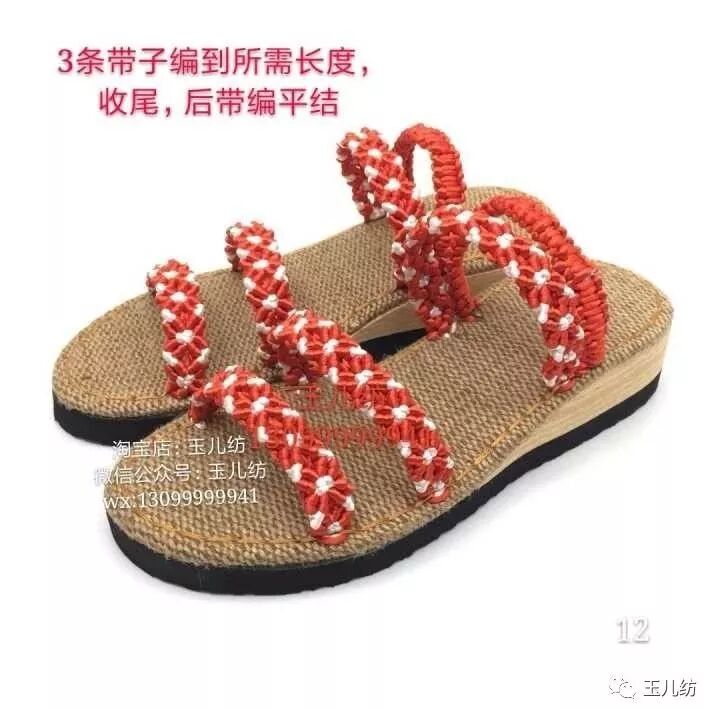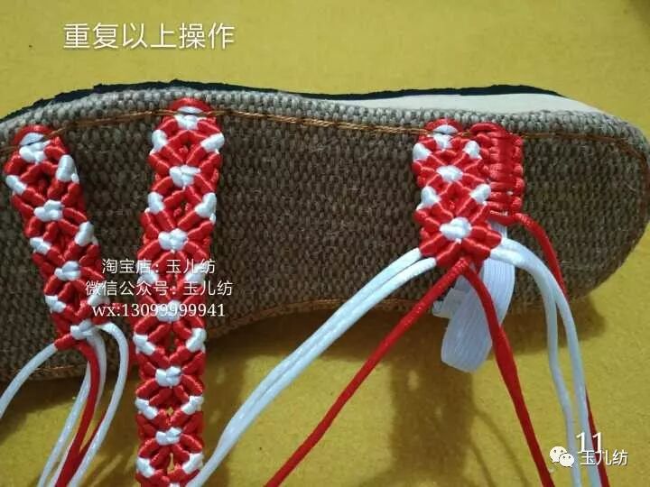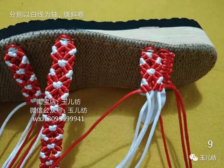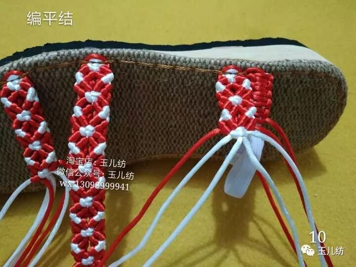 12,松紧带是以红线编平结,松紧带为中心线,前面3条带子根据自己的脚型决定编多大。